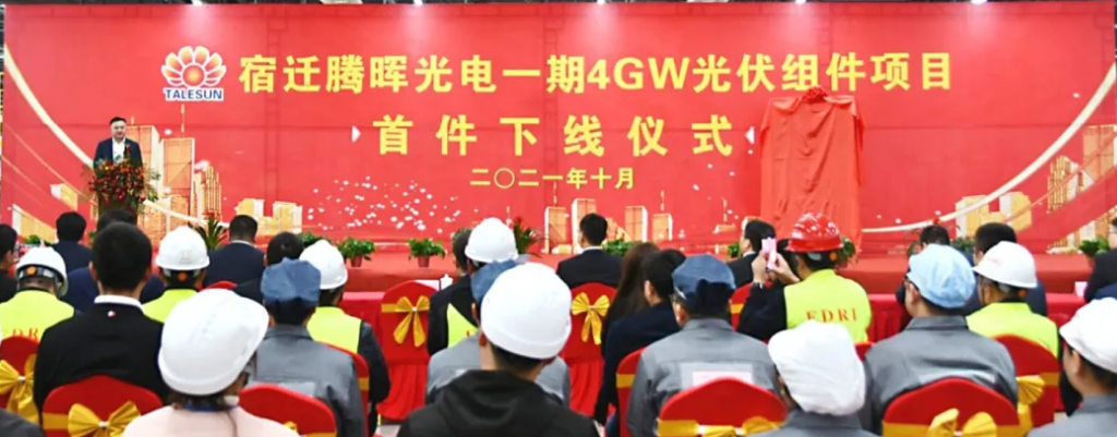 宿迁腾晖光电有限公司项目规模为年产12GW组件、铝边框及铜焊带等业务,项目全部投产后,可实现年开票销售200亿元。仪式上,李爱华与王伟峰共同为宿迁腾晖一期4GW组件项目的首件成品揭幕并签名留念。